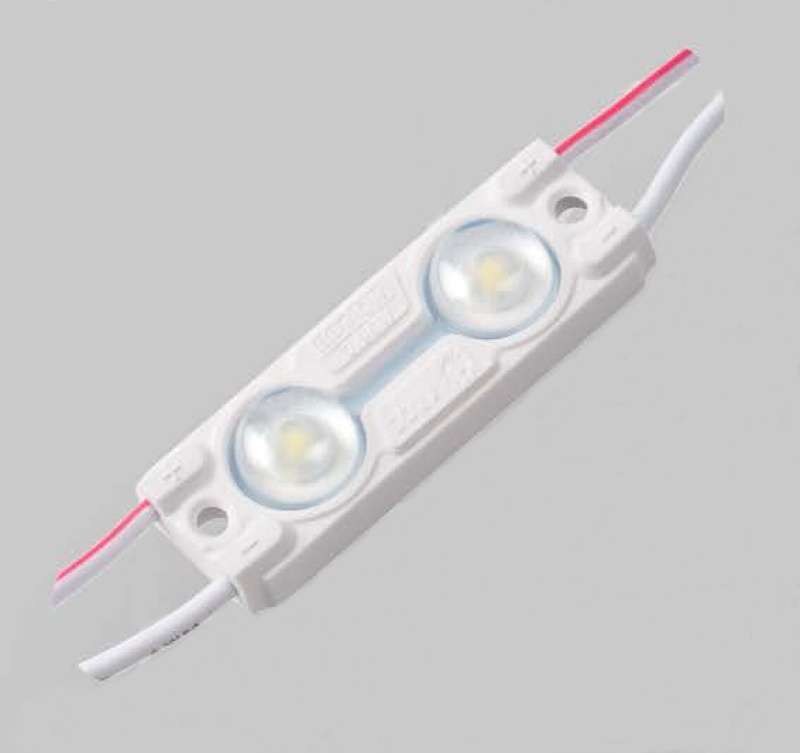 Светодиодный модуль выступает элементом как статических фигур, лайтбоксов, так и применяются для формирования динамичных эффектов. Конструкция предполагает наличие рассеивающей линзы и 2 светодиодов.